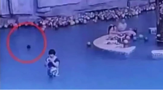 监控录像显示,当时孩子就在妈妈身后。这位母亲背对着孩子,在玩手机。孩子就这样慢慢沉入了水底。