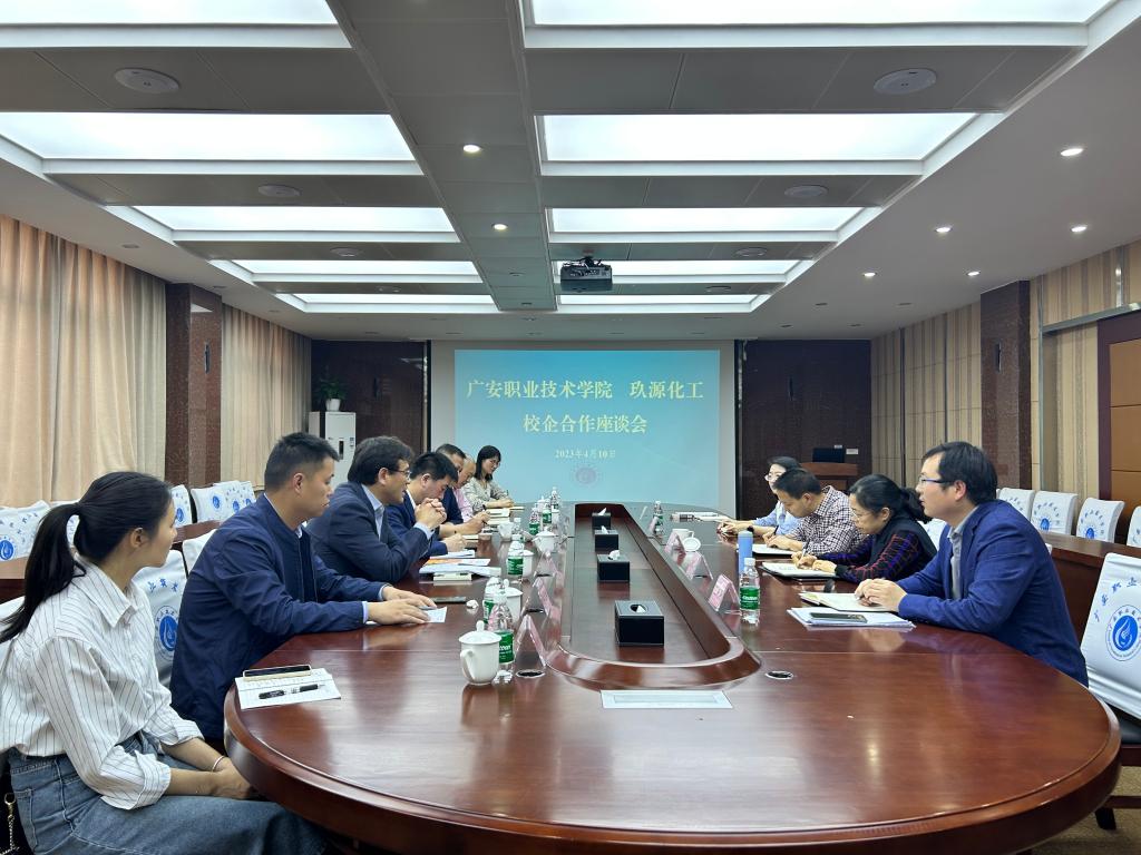 4月10日下午,广安玖源化工有限公司总经理何希甫一行3人来校与taptap点点体育开展校企合作洽谈,广安经开区党工委委员、副主任张学秋,广安市经济和信息化局总经济师唐刚及相关科室负责人,学校党委委员、副校长袁驰及相关部门负责人参加了座谈会。